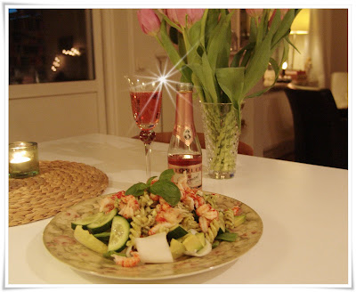 Pasta med pesto, kräftstjärtar, tomater, sockerärter, avocado, endivesallad och gurka.